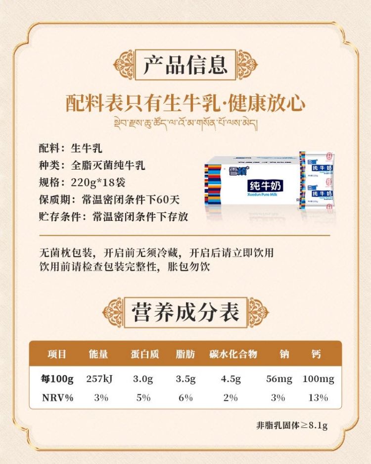 雪顿纯牛奶高原牧场儿童牛奶学生早餐奶袋装
