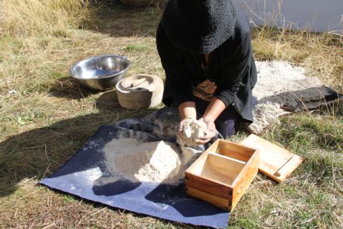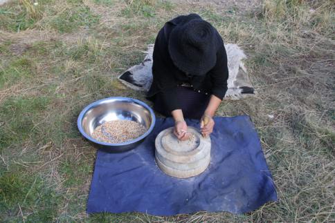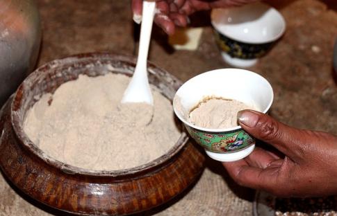 糌粑是藏族牧民传统主食之一。“糌粑”是炒面的藏语译音,它是藏族人民天天必吃的主食,在藏族同胞家作客,主人一定会给你双手端来喷香的奶茶和青稞炒面,金黄的酥油和奶黄的“曲拉”(干酪素)、糖叠叠层层摆满桌。糌粑的制作方法简单,将青稞粮食(属大麦类,有白色、紫黑色二种)晒干炒熟、磨细、不过筛,这样制成的糌粑能保留原汁原味。糌粑与我国北方的炒面相似,但北方的炒面多是燕麦粮食制作的,先磨后炒,而玛曲的糌粑却是先炒后磨,不除皮。