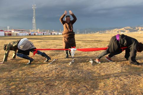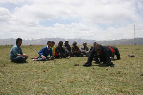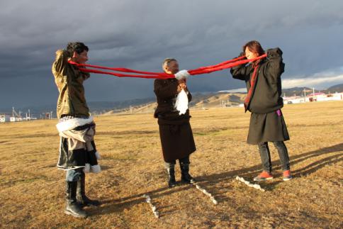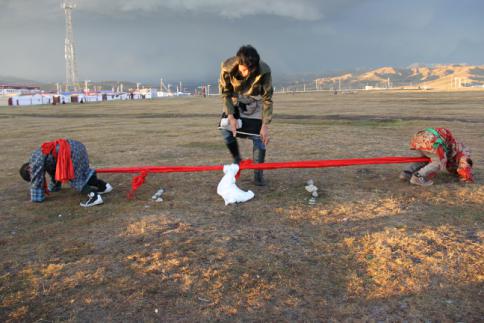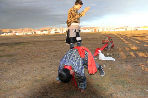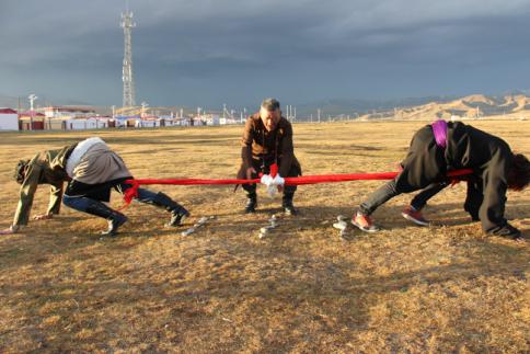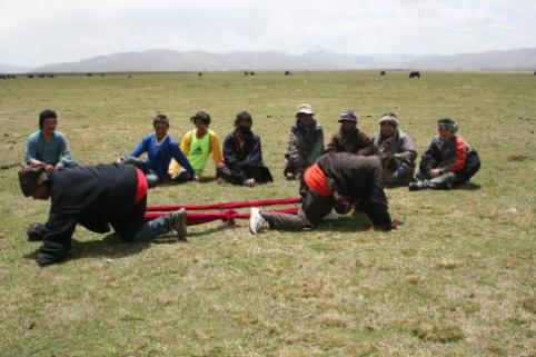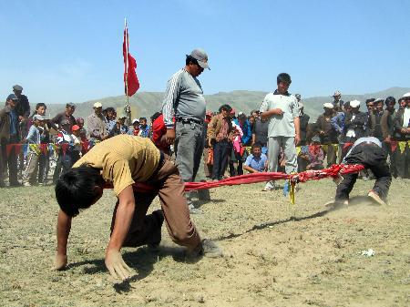 大象拔河,藏语叫“浪秦洒合希”。藏族人民崇敬大象,认为大象是吉祥物,因此,大象拔河这项运动深受牧区群众的喜爱。大象拔河比赛时,两人为一组,采用三局两胜制,每局比赛时间为3分钟,并轮流交换场地。比赛绳一般长10米,直径25-30毫米,绳头两端各有一个周长1.5米套环,比赛时,运动员将套环在各自的脖颈上,转身相背,使绳从颈下通过腹部并从裆下穿过,两手、两膝、两脚着地,标志带垂直于中心线中点。比赛按运动员体重分60、70、80、90公斤四个级别。由于此活动集比赛。娱乐为一体,简便易行,深受牧区群众喜爱。比赛开始后,两人用力互拉前爬(动作似大象,藏族又崇尚大象吉祥和力大无比,故名大象拔河),用腿腰肩颈的力量奋力向前拖动布带,以将红布标志拉过河界者为胜。颈力比赛,又分为两种形式。第一种形式为参赛的两人相对坐在平地上,把打结的绳环套在颈部,双脚相抵。裁判一下令,双方都以脖颈用力,想方设法把对方拉向自己一侧。哪方臀部离地或绳环中心线偏向对方,即视为失败。比赛时不能用手抓赛绳,否则为犯规。第二种形式与大象拔河相似。双方面对面站立,把打结的绳环套在脖子上,然后用颈部力量往后拖拉。谁先把赛绳中间的标志拉过界即获胜。