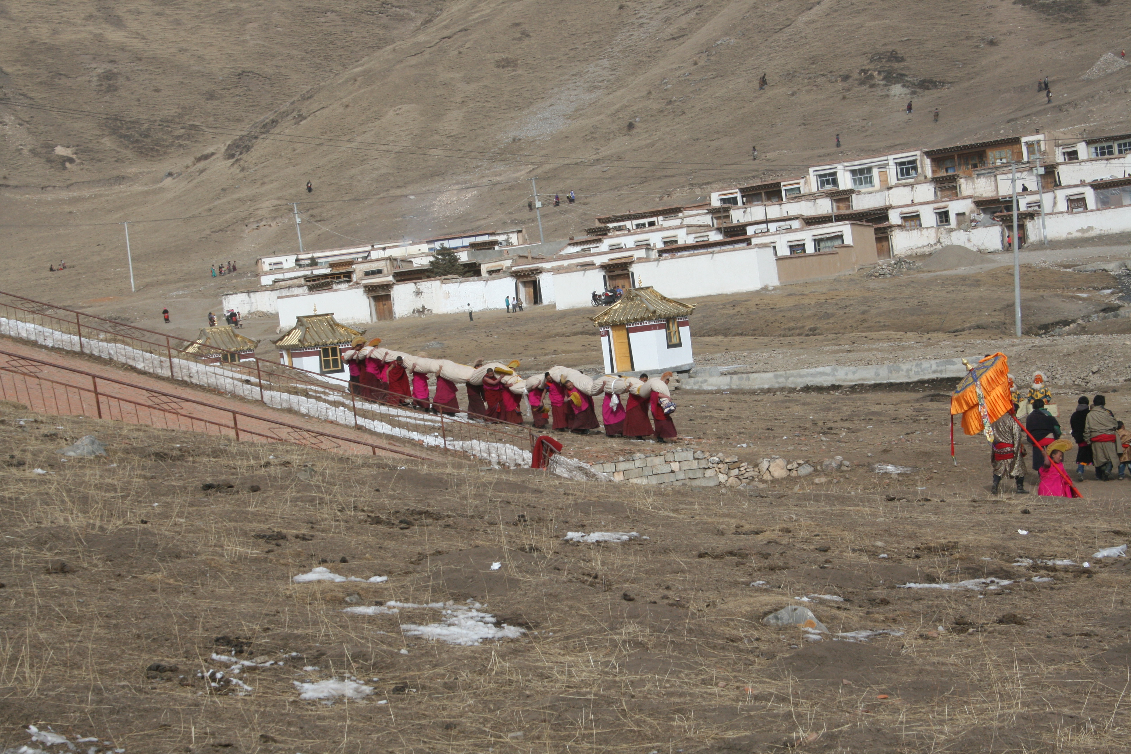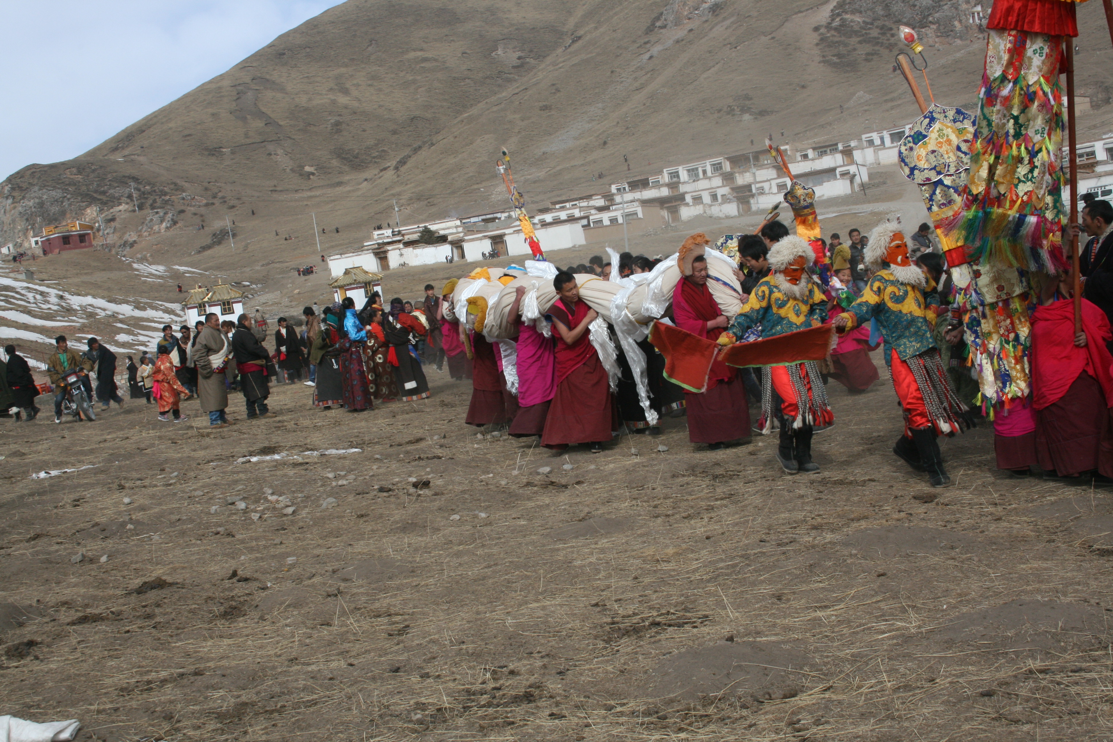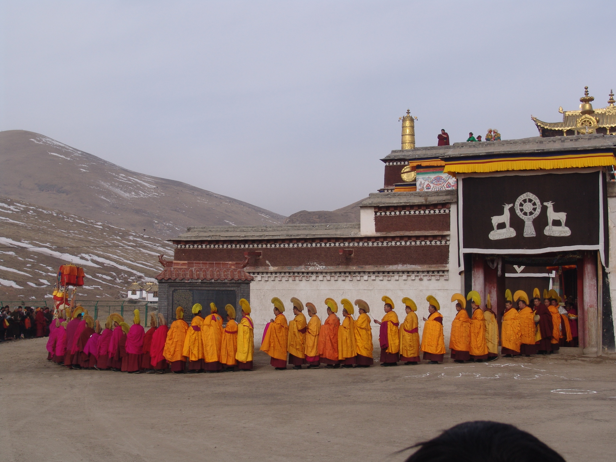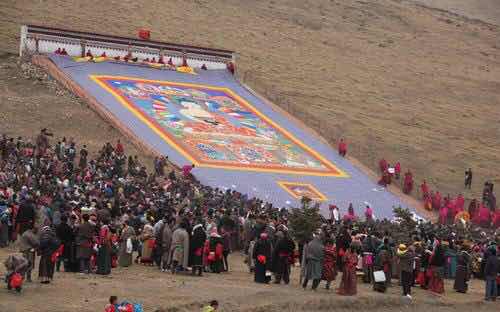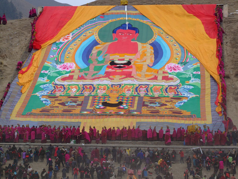 节日期间,将长约30余米的五色佛像,由寺院中年青力状的僧人几十人甚至几百人从寺院藏宝室抗出置晒佛台上展开,供善男信女者或信徒的观詹佛会。身着紫红色的袈裟的喇嘛,口诵佛经,在寺院主持的组织下,信徒们整装,肃容,观詹佛容,在佛像前膜顶礼拜,场面极为宏伟壮观。