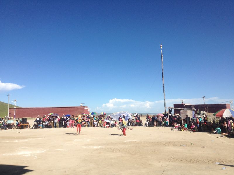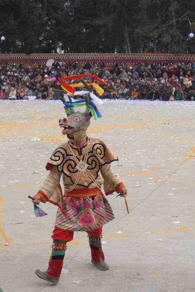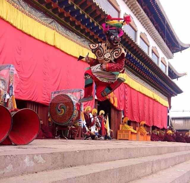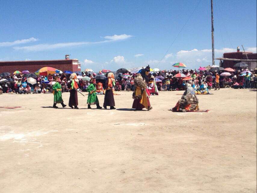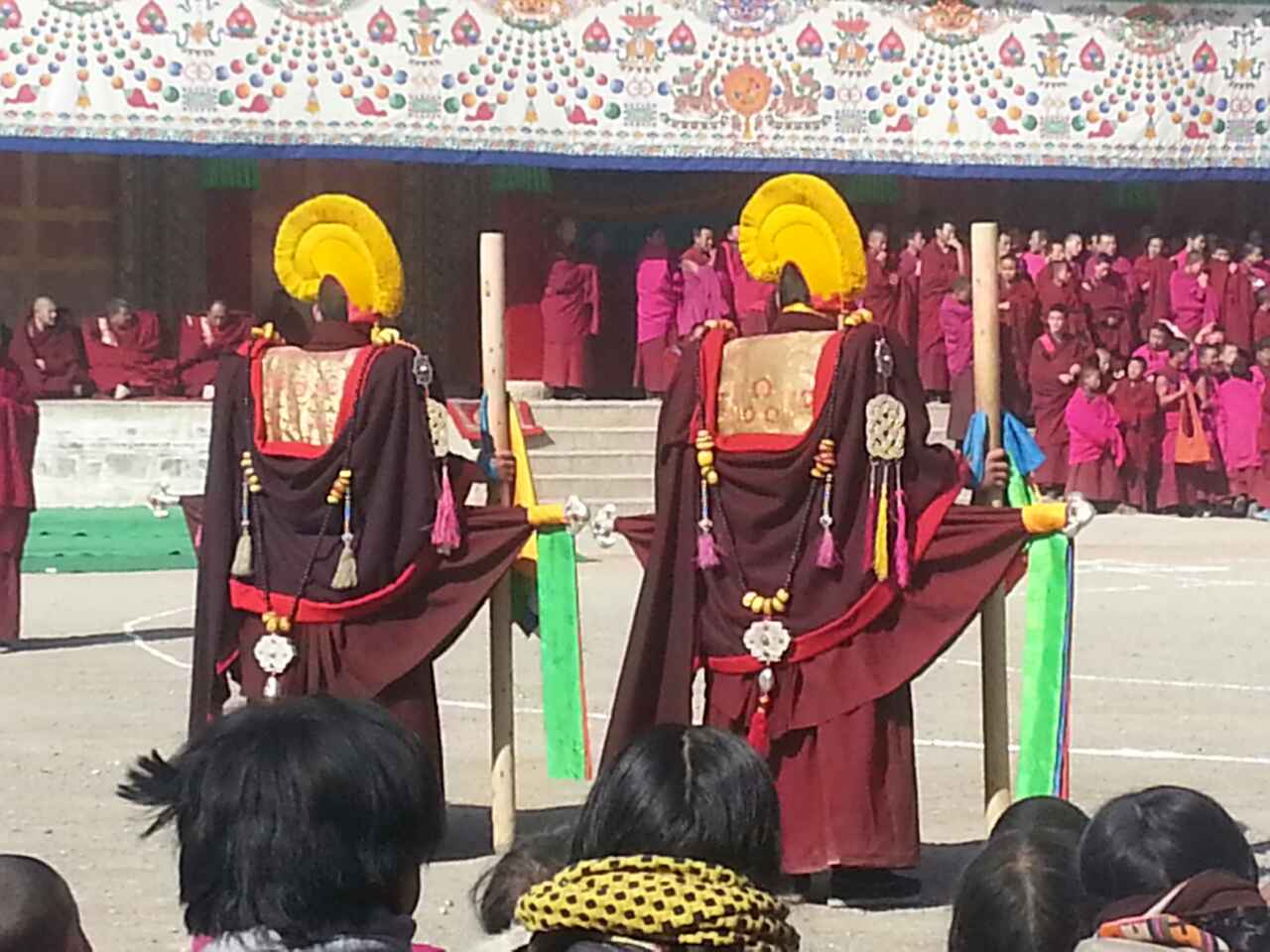 经过20分钟,两个白发老翁手里手拿着鞭戴着弓箭,后面跟着两个儿童,从寺的一旁轻步而出,彼此间答问着,表示是结伴出来行猎的。后来,他们发现了野兽,忙叫它的猎童拿弓,接着准备射击,在这紧要关头,坛上的喇嘛忽然叫停,并且告诉他的杀生罪过,于是,猎人心里深感忏悔,请求宽恕。这时,鹿和狼都欢舞而出,与老翁、儿童。还有最初出场的神共舞。一老翁把弓箭呈给喇嘛,喇嘛便领他们步登仙界。观众们也起立合声诵念经语,跟着喇嘛的后面走,可是喇嘛走走停停,而人们诵经也越来越急,过一会儿才到殿前,他们理想的仙界。钟鼓齐鸣,一年一度的跳神节在热闹喧闹声中结束。