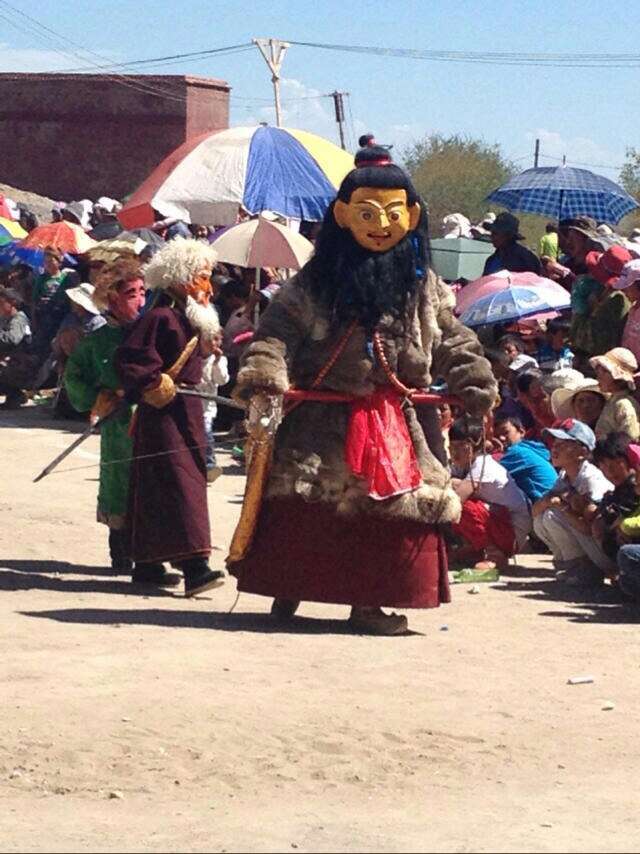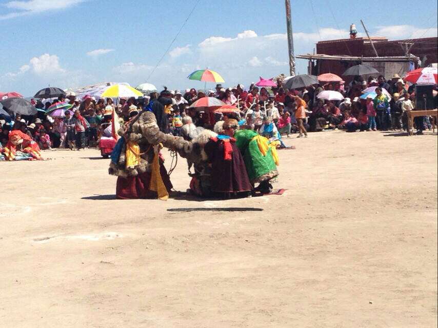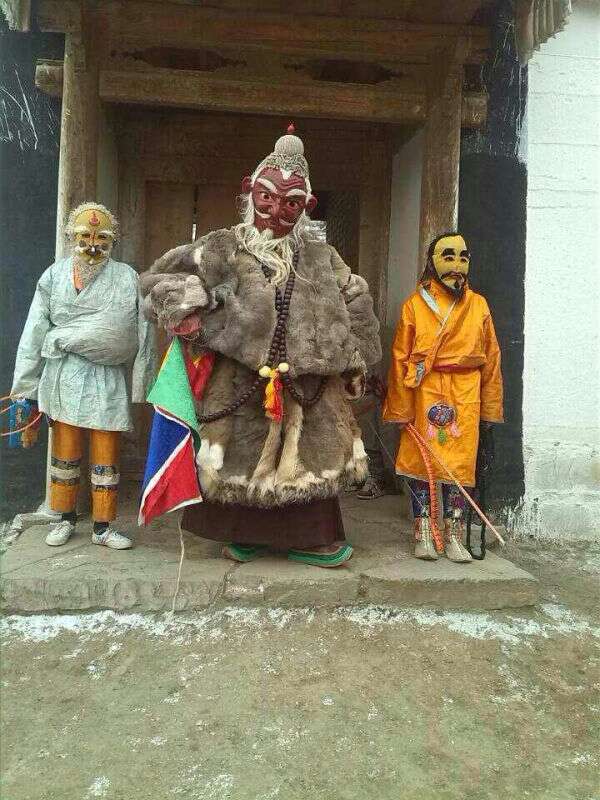 过了一段时间,两个戴狼头面具、穿红衣的直奔出场,双腿曲跃,双手交叠伸出。这舞姿显出轻佻与奸诈,最后舞到坛前,跪地祈祷,喇嘛答诵后,狼就坐在鹿的两旁。