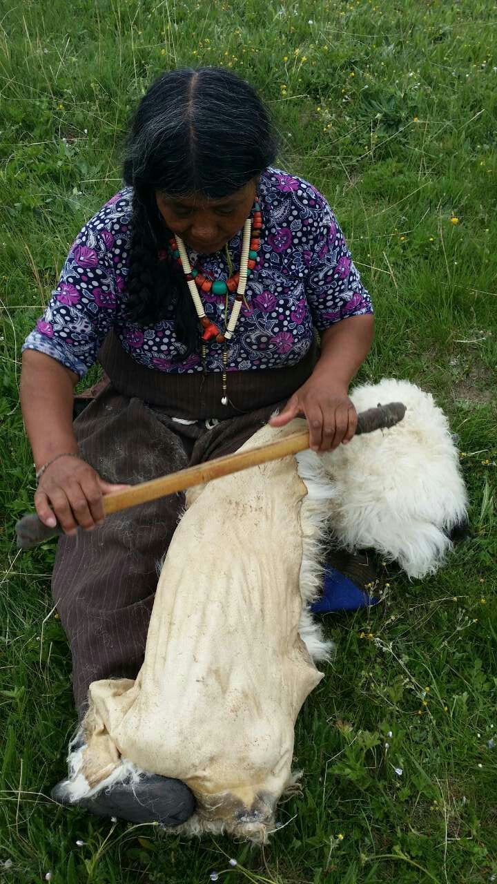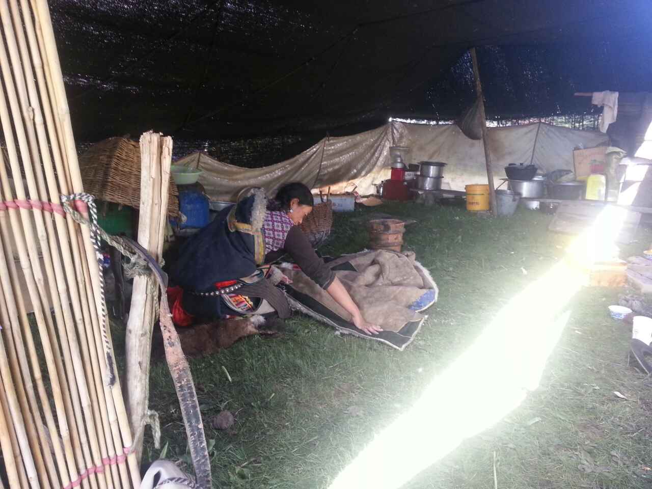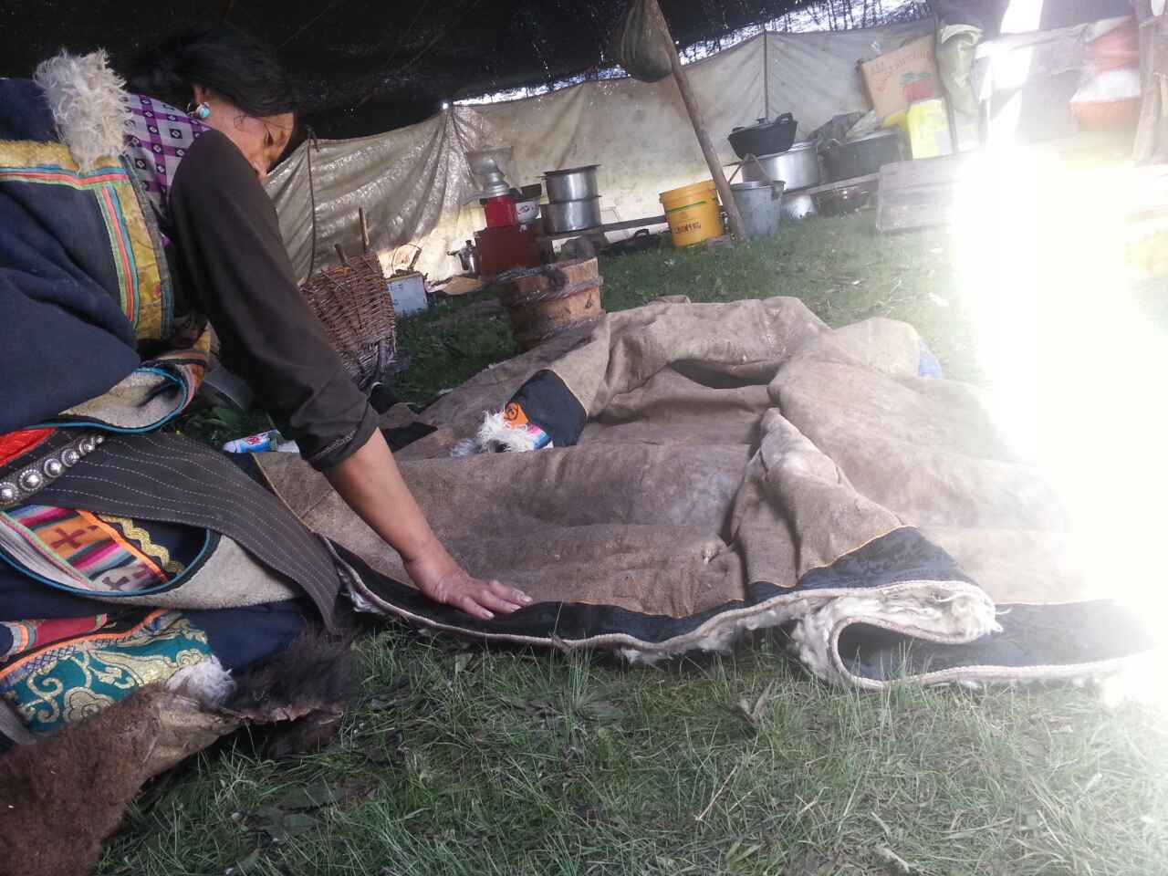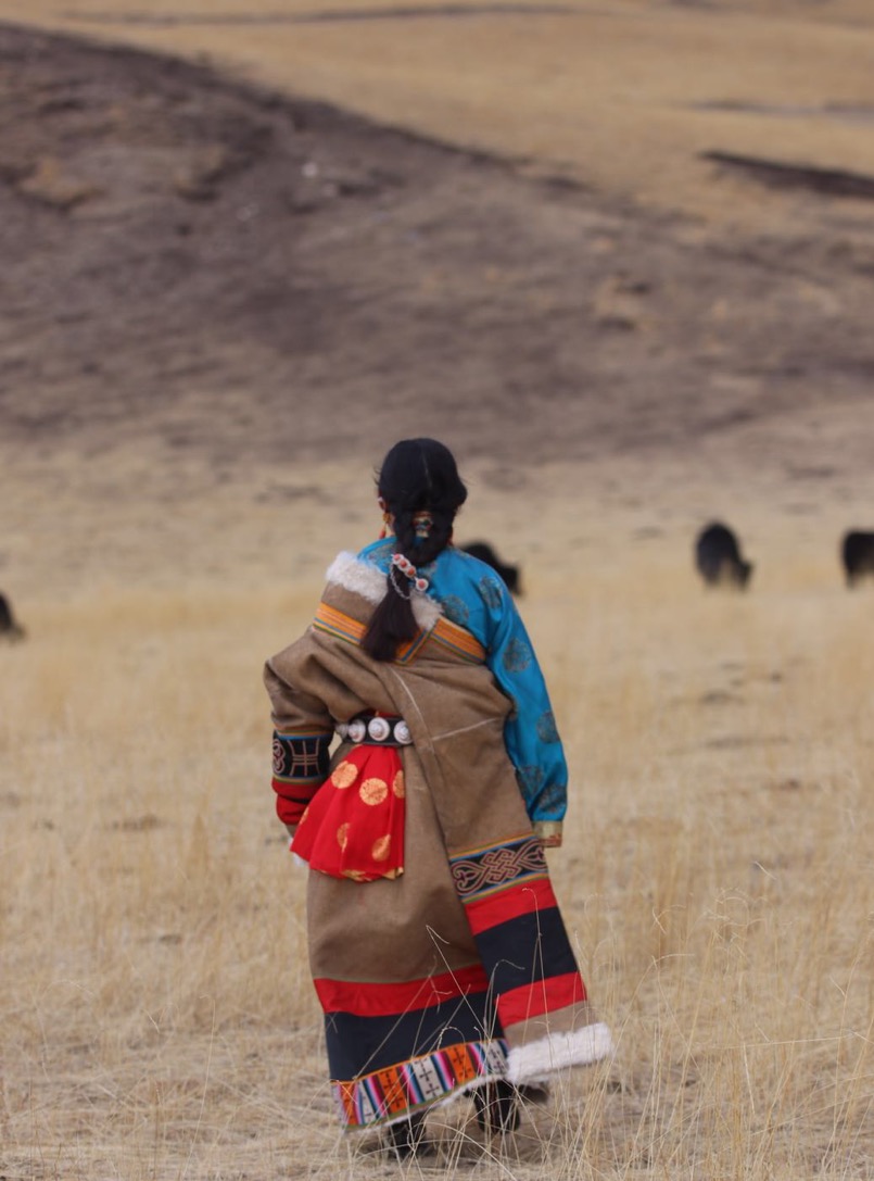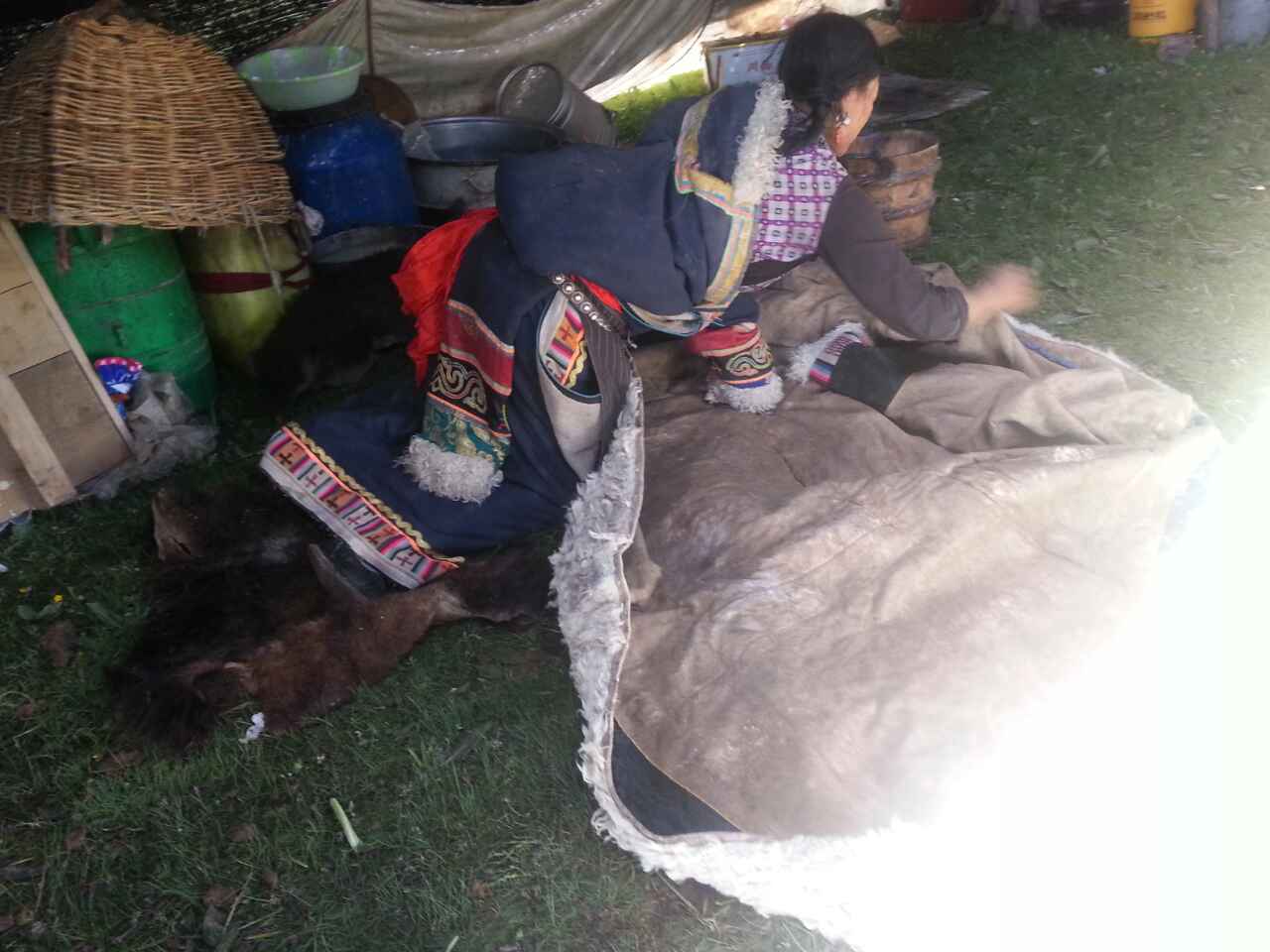 玛曲地处青藏高原东端,这里气温低,风沙大,又是辽阔的草原、天然的牧场,生活在这里的人们就要选择便于起居、行旅、保暖御寒的服装。因此,牧区藏族穿着以皮袍为主,它结构肥大,袖口宽畅,穿着自如,白天阳光充足,气温升高时,可脱袖露臂,调节体温,夜间可解带和衣而眠。牧民的皮袍离不开腰带,穿时提起下摆与膝盖平齐,腰带一束,怀里形成大囊,里面可装不少随身用品。皮袍是用土法加工的绵羊皮缝制的,既经久耐用又抵风御寒。普通皮袍,男式的宽腰、大襟、肥大,襟、袖和下摆用10至15厘米宽的黑绒镶边,但也有不做装饰边的。女式皮袍的襟、袖和下摆先用宽10至20厘米的黑平绒镶边,再用红、蓝、绿三色平绒(各宽5至10厘米)镶边。