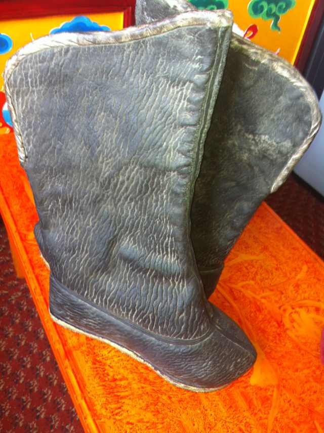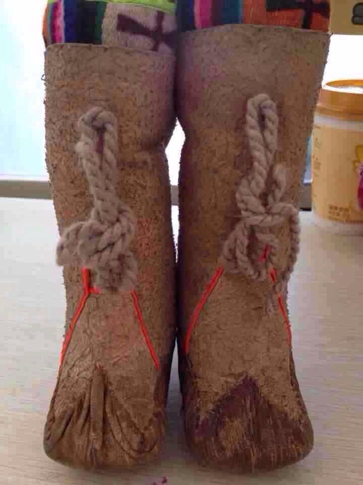 藏族男女通行的长简靴,底高2厘米,腰高至小腿之上,鞋面用红绿相间的毛呢装饰,鞋腰上也有线条、花纹。藏靴可分为“松巴”和“嘎洛”两大类。松巴靴底都是用牛绒捻的绳纳制的。还有一种靴底用牛皮包裹,一般多见于冬天穿着。其中较为高级的称“松巴梯呢玛”.用牛皮制底,并以粗毛线或绵线密密缝制,厚达1厘米多;靴帮色彩斑斓,分别用红、黄、绿、蓝等8种颜色的丝线在靴帮上绣出美丽的图案;靴面也绣花,十分艳丽。这种靴,做工精致考究,喜庆日子里才穿用。