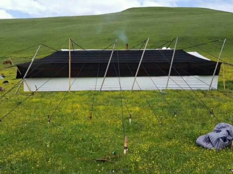 牛毛帐篷没有任何图案,棉布帐篷大小不等,制作方法比较复杂,图案普遍采用“五福捧寿”图,“祥云”纹,佛八宝中的“盘长”等。制作帐篷时一般制作由蓬顶、四壁、栋梁、撑杆、蓬绳、木厥等组成。特大帐篷由10米长、5米宽。帐篷顶留有方孔天窗,能通风、采光、走烟。牛毛帐篷搭建简单、拆迁方便,经济实惠,经久耐用,遮雨、御寒性能较好,如果损坏随时可以补换。布帐篷沿边图案美观大方,黑白鲜明,清新典雅。藏式帐篷成为藏族历史的重要一部分。