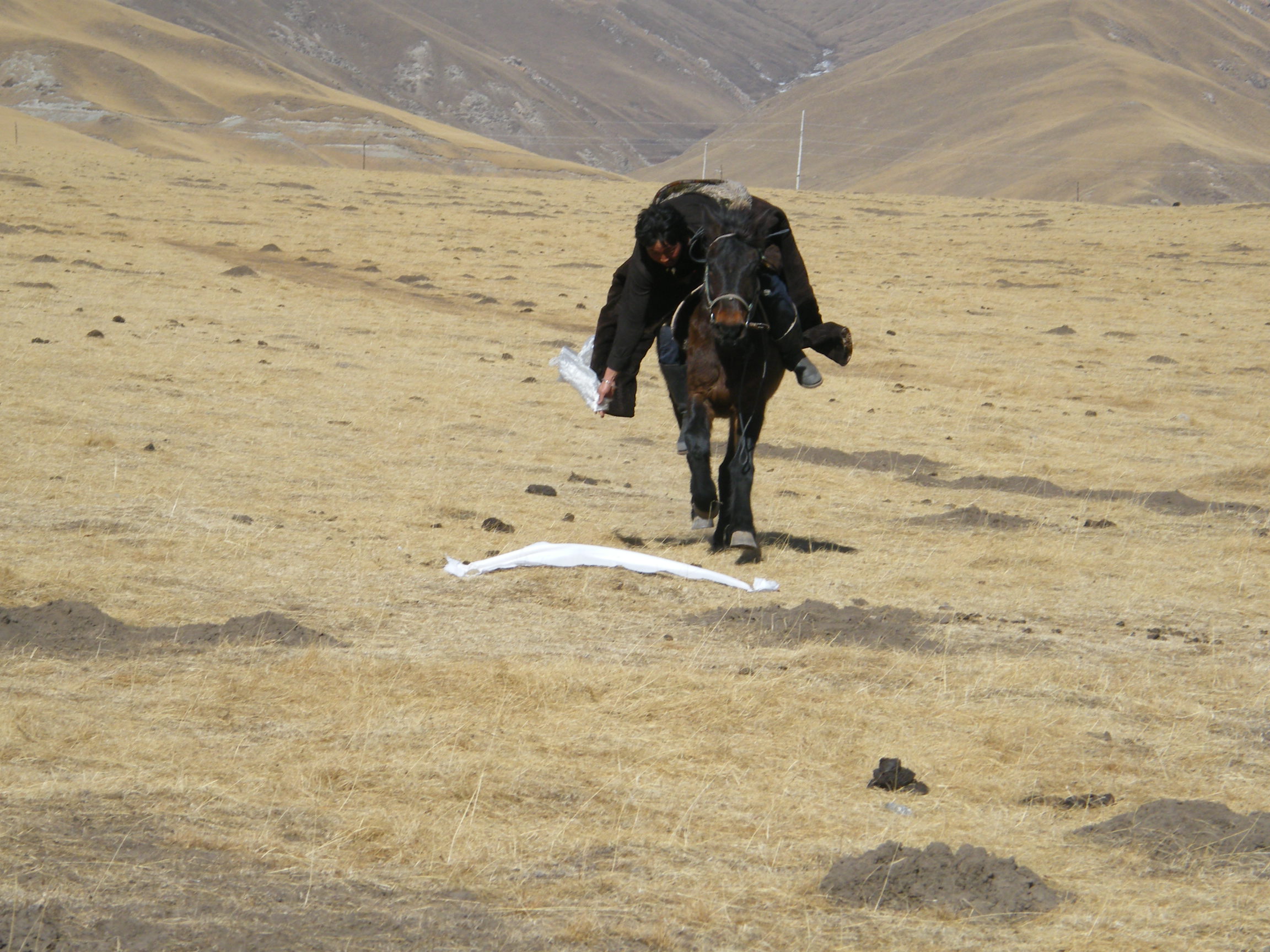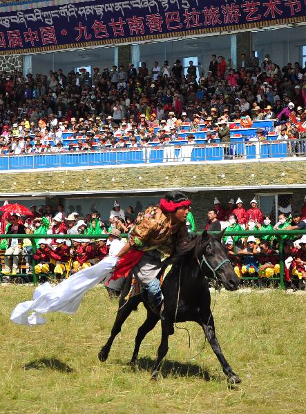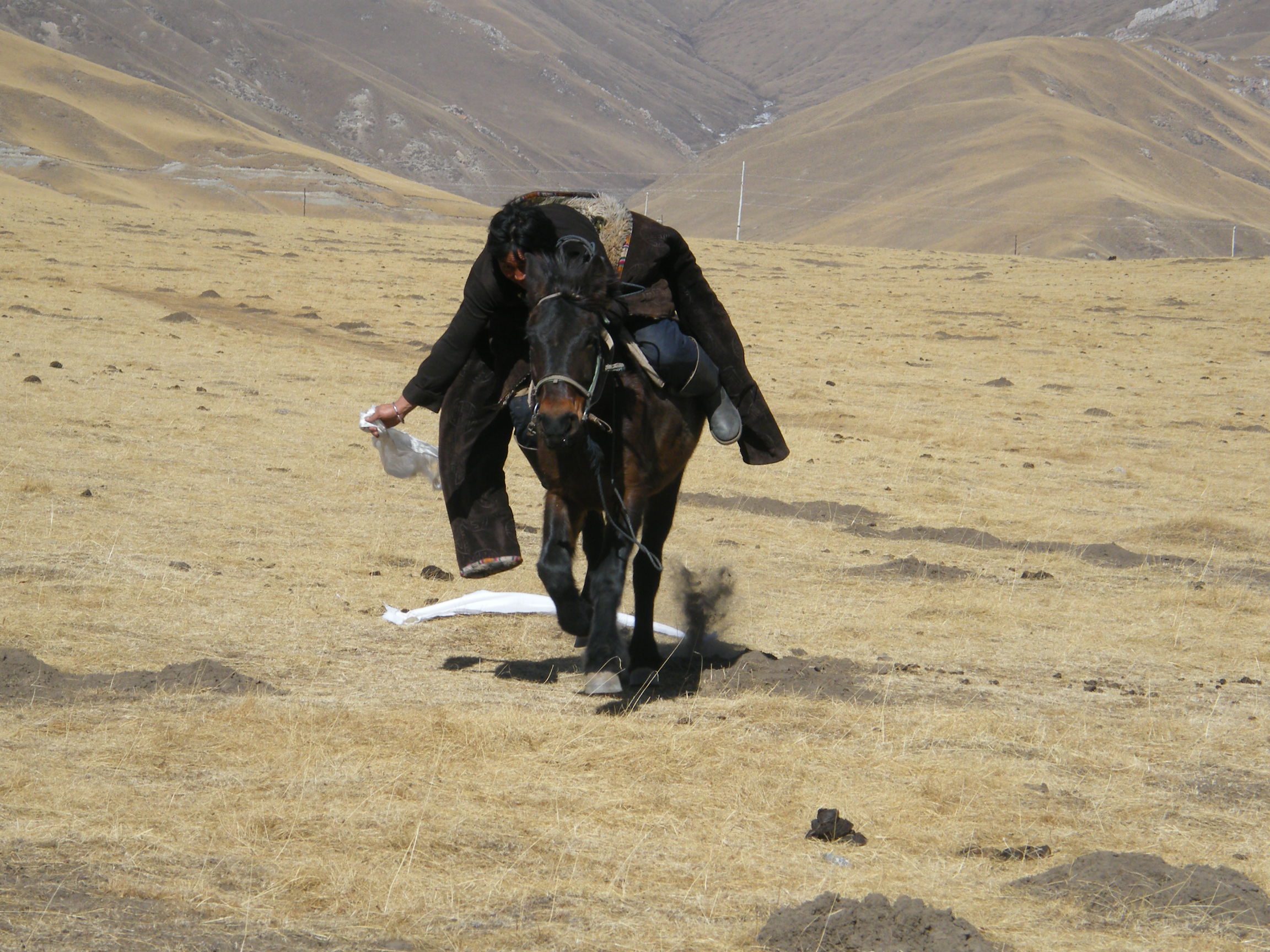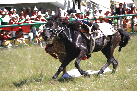 自古以来藏民族与马结下了不解之缘,一生下来就在马背上生活,早已成为人们交往、生产、战争的重要工具和帮手。骑马捡哈达已有一千多年的历史了,此项活动难度较大。在赛马前十天半月,牧民们就开始驯马(马种不限,尽可能不用母马和阉马)。驯马的方法是:每天给马披裹毡子跑两次,且早、中、晚都要把马牵到河中洗澡。一般要给马泡水和泼水,泡到肌肉发抖再牵到岸上慢慢溜,这样训练过的马耐力很好,跑起来不喘气。赛马可由马主骑乘参赛,也可有别的骑手骑乘。参赛的马往往要打扮的漂漂亮亮,配上美丽的鞍具,马头马尾还要扎上红红绿绿的五彩布条。比赛开始后由草原各部落能骑善射的人小伙子们,在规定的距离、时间中用最快的速度骑马弯腰捡起放在跑道上的哈达,捡的越多说明技术越精湛,尽可能使每一个参加比赛的人都通过自身的身体动作来完成。此项活动把体育和娱乐融为一体,且不受场地、器材的限制,规则简单易行,容易为人们所接受。比赛时四周人头攒动,呐喊助威,场面十分激烈精彩。获胜者在群众的欢呼声中,由长者牵马绕比赛场一周,接受观众敬献的哈达。骑马捡哈达这种这种优秀的民族传统体育项目,不仅具有很强的健身价值,而且有很高的观赏价值和丰富的娱乐观赏价值,对振奋民族精神,活跃人民精神文化生活起着积极的作用。