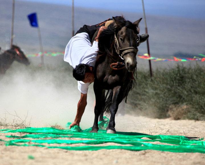 骑马捡哈达是一项以速度和技巧相结合的比赛,是指在长100米,宽3—5米的距离上每间隔5米横放一条哈达,一般放10—20条不等,它有起点和终点,以鸣枪和吹号为号,众马齐出,经过放有哈达的跑道时,骑手弯腰迅速捡起哈达,结果以达到终点捡哈达的多少计胜负。
