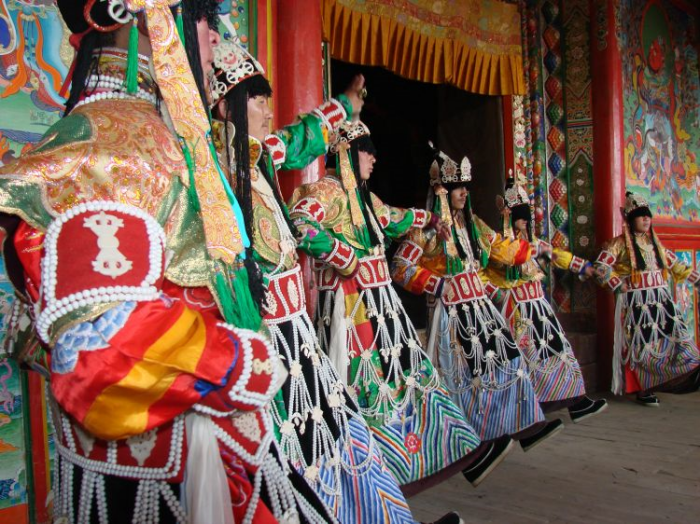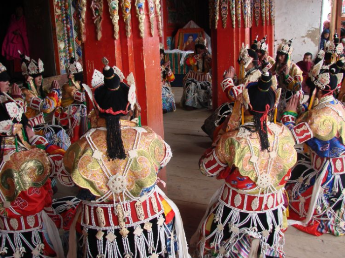 玛曲县12座寺院中,除木拉寺,阿万仓娘玛寺为宁玛派寺院以外,其他均为夏河拉卜楞寺院的附属寺院。这些法舞都来源于拉卜楞寺,而木拉寺、阿万仓娘玛寺的法舞则源于藏传佛教法舞之始----莲花生大师在西藏传教士表演的法舞,因此,各寺院跳法舞的时间不一。比如曼日玛参智合寺为农历正月十三的毛兰木法会和农历二月二十七日、三月初八日根据有关时轮的教仪举行的法会等;尼玛外香寺为农历七月十三日柔扎法会等。