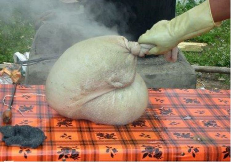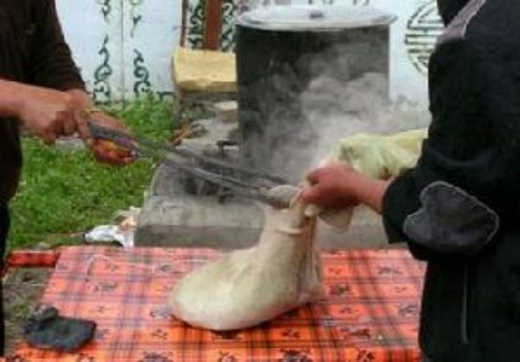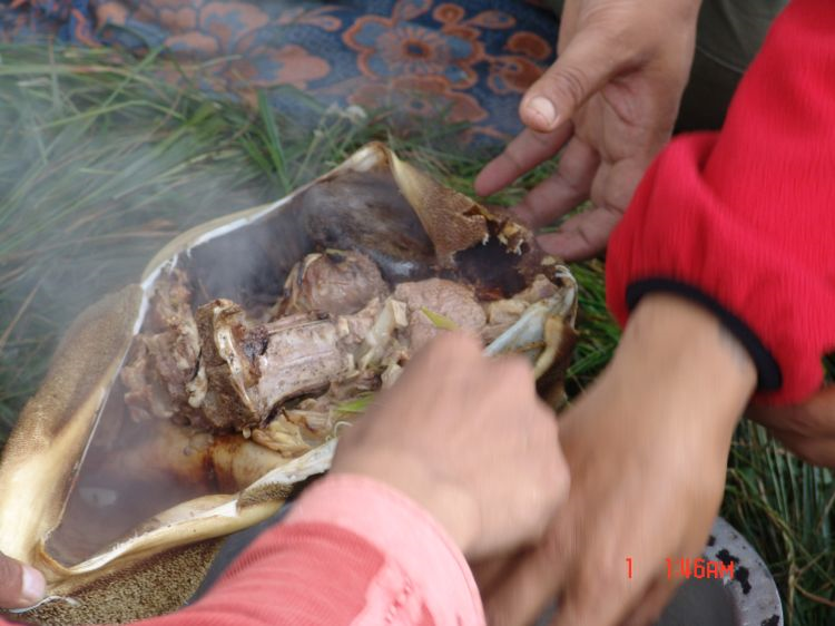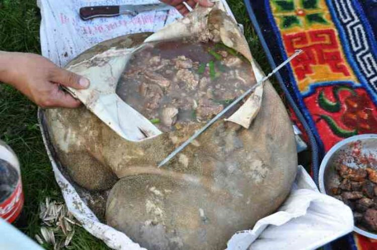 多食合是藏语,意即“石烧”,是一种玛曲县牧区独有的野外食肉方法。制作前,先捡一些比拳头小的鹅卵石洗净,垒起放在火中猛烧,把刚刚宰杀的新鲜的羊肉,骨肉分离,把肉块分割成小块,佐以食盐,花椒粉等调料拌匀,把羊肚洗净。得把石头烧红以后,就把办好的调料的肉块装一小部分到羊肚内,随之装进几块石头,手在外面反复搓揉羊肚,直至把肉块和石头装完,再用绳子扎紧羊肚口。随着肚肉蒸汽的增多,温度的升高,肚皮越胀越大。这时稍放掉一点气,不至把羊肚皮崩破,并让其在草地上轻轻翻滚,待热气降温,肚内的石块停止抖动时,在肚皮上用刀划开一点小口,取出积在里面的肉汁,然后将肚皮整个划开。至此,一道地地道道的草原野餐美食就做成了。品尝时,吃一块肉,喝一口汤,原汁原味,不油不腻,别具风味,妙不可言。