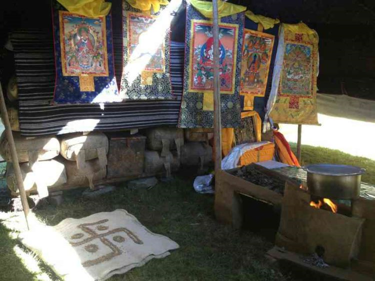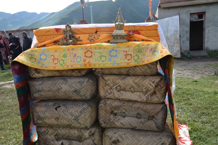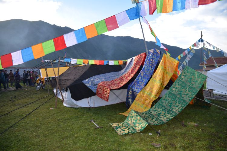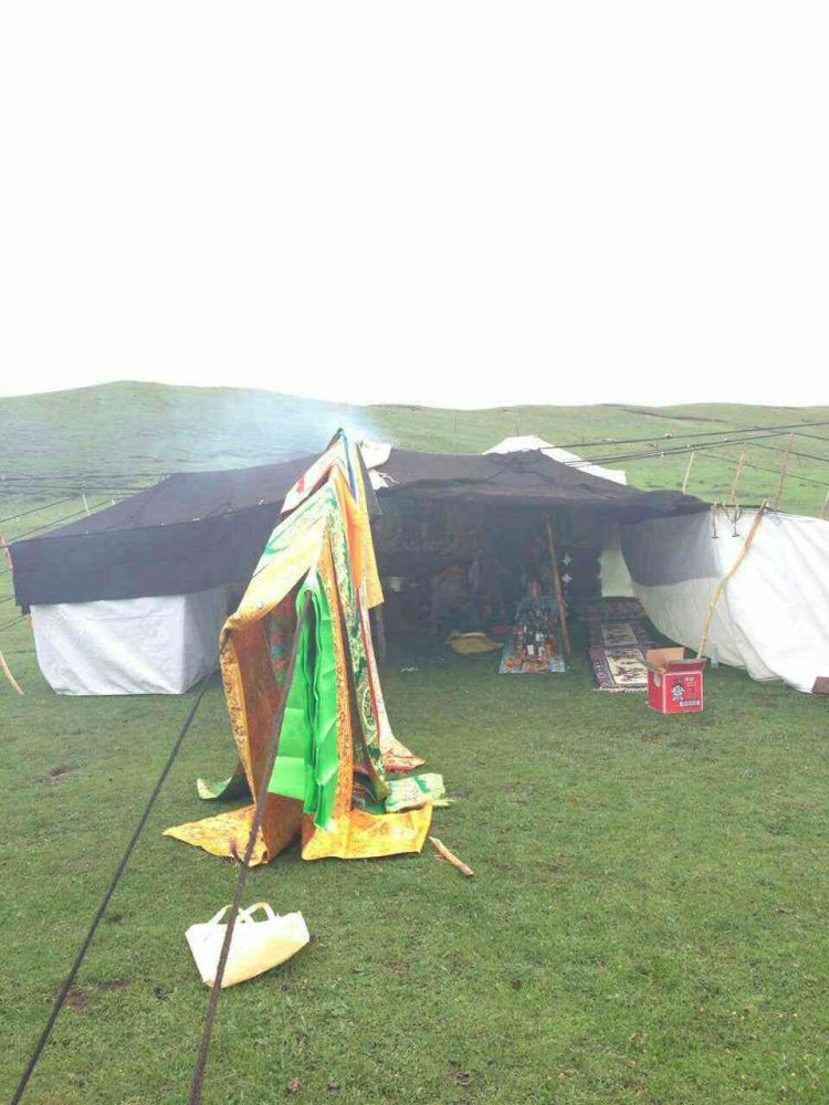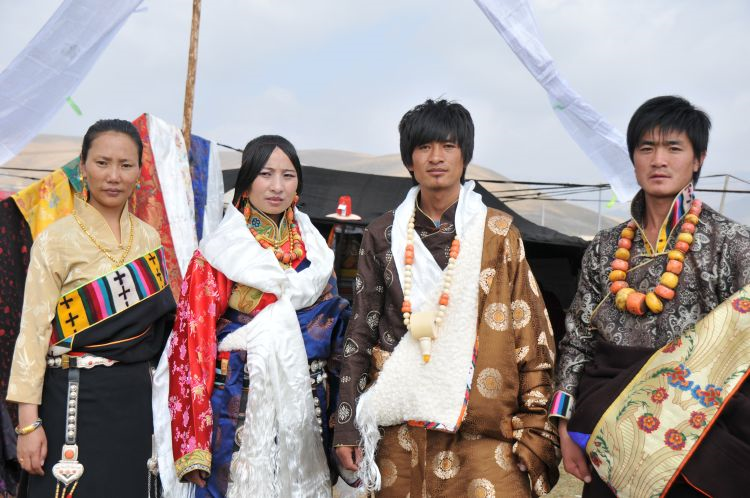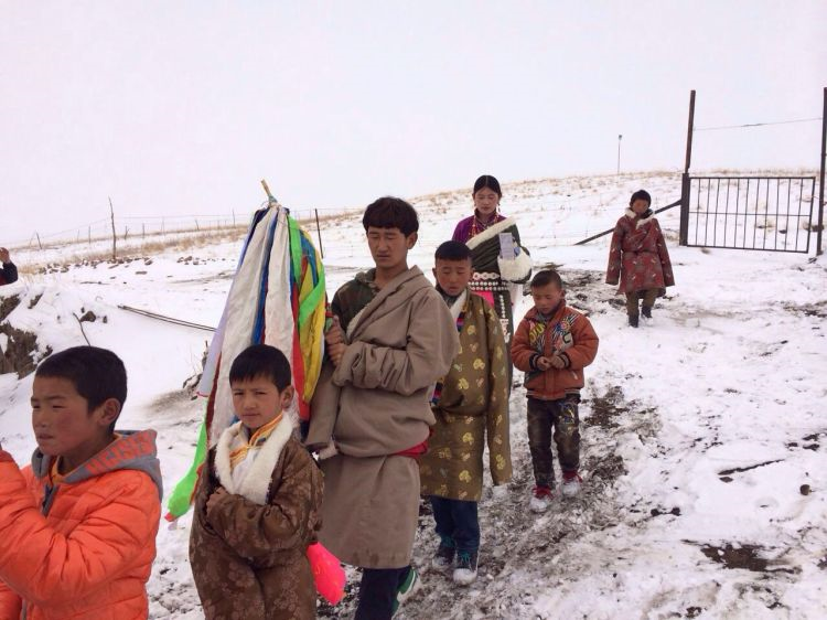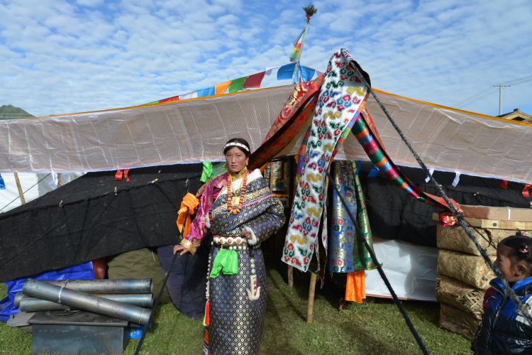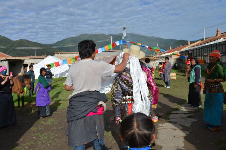 二、婚礼 在精心选定的结婚日子,新郎与亲友们带着哈达和礼物等去新娘家迎娶,时间多为天两前。新郎、伴郎、伴娘、到女方家,女家招待茶点之后,新郎临行前便向女方父母说:“领走的是人,留下的是哈达”。女方父母给新郎转送一瓶酒,一条哈达后迎亲与送亲的马队同时起程,女方母亲便将准备好的洁白牛奶,一勺一勺的洒起向着女儿与送亲队伍远去的背影,以示祝福。新娘到婆家后,撒糌粑表示喜庆吉祥与祭祀鬼神。同时,请喇嘛念太平经(吉祥颂)和“煨桑”,并围着桑转三圈后,举行开灶礼。由一名妇女领着新娘在灶中生火,锅里盛满牛奶并放上红枣和茶,奶沸后新娘用锅勺舀起淅沥一点在火焰上,表示新娘开始了新的生活。新郎盛满一碗(一对新碗)牛奶敬家人,客人依次轮尝一口,新郎新娘也喝一点。开灶仪式后欢宴贺客,先敬茶点,新郎向贺客敬酒,客人们唱起祝福的歌曲,此后端上手抓羊肉(主食)、包子、厥麻米饭等。宴席毕年轻男女开始歌舞,直到深夜才尽欢而散,也有闹新房的习惯。结婚三天,新郎新娘即可住进男女家长婚前各准备一半新缝制的帐篷里,并分给他们一部分牲畜,成立新家庭,不再和父母居住,但也不有分居的,一般为小儿子,赡养父母,继承家产。