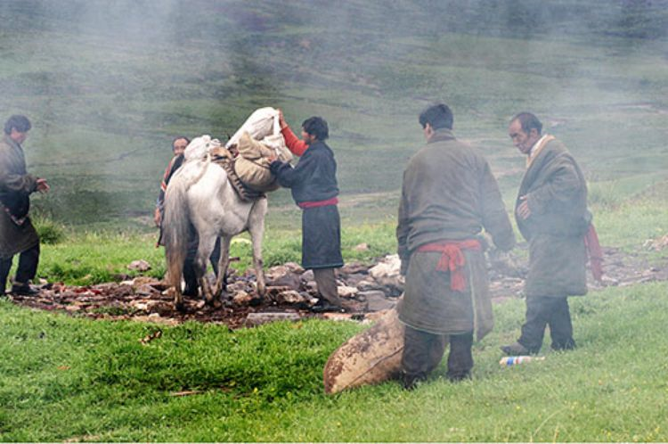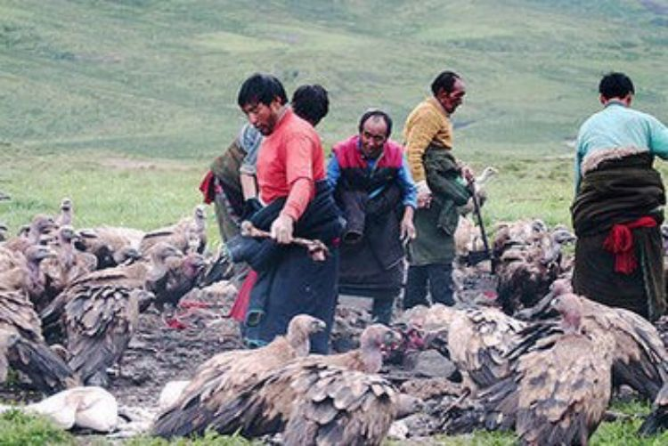 天葬是玛曲牧区最普遍的葬法,人去世后将尸体卷曲起来,或用绳捆成弯形,用哈达包住口,黄布或红布盖之,请活佛僧人念经,放于帐篷或房屋的一角,并用布料隔起来。停丧时间长短一种时请僧人打卦;第二种是请懂历算的老人看星相,算时间之后才能送葬;第三种是择吉日送葬。停葬时间要在尸体前几本经书、放一碗茶,点几盏酥油灯,昼夜长明。离寺院近或着有条件的人家,会请僧人念经。送葬,往往是天不亮就出发,一般子孙不送葬。太阳出来前一切工作准备完毕。尸体用马或牦牛驮运,一般是横搭在马或牦牛背上;或绑在一侧,另一侧坠以其它东西使其平衡。一般天葬在“惹甲巴”(天葬者)的主持下将尸体运至天葬台上,附近煨起桑,藏语叫“饲尔”,浓烟骤起。随行念经的僧人吹起长筒铜号,呜呜的声音,悠扬而远,唤秃鹫来食。秃鹫听到声音,群飞前来,环山如人而立。此时“惹甲巴”或死者亲属扒光死者的衣服,一般从背部下刀,先割碎肉,再将砸碎的骨头及脑浆、头发等拌上糌粑、酥油,让秃鹫啄食。喂鹫时,先给内脏、其次骨头,最后肌肉。秃鹫食尸时,先待其中之王食起死者的眼睛后,群鹫方才食尸。如果死者的整个尸体被全部食光,就意味着生前积善行德,已经“升天”。若是时过数日仍未食尽,家人尚需请僧人念经消孽,再行超度。送葬回来后先用桑叶水洗手,再用奶水洗手及脸。