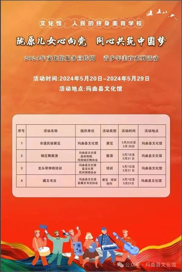 2024年文化馆服务宣传周活动由甘南州文化馆主办,各县市文化馆协办,紧扣“文化馆:人民的终身美育学校”主题,运用阵地服务、流动服务、沉浸式体验等多种手段,面向社会各界开展全民艺术普及服务,不断丰富服务内容、提升服务水平,吸引群众走进文化馆,树立“人民的终身美育学校”良好形象。充分发挥文化名人、行业专家作用,通过举办丰富多彩的宣传活动,有效扩大服务宣传周活动覆面、参与度,凝聚文化馆行业力量,提升行业影响力。