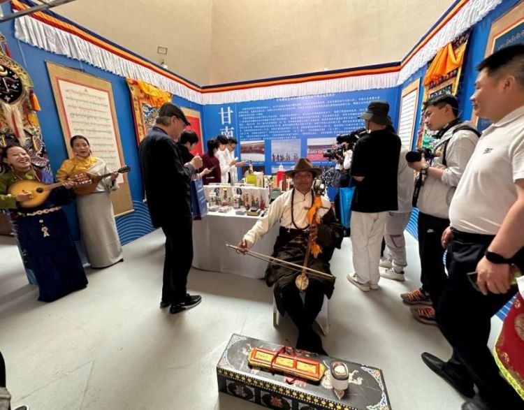 为深入贯彻落实党的二十大精神和习近平总书记关于非遗保护重要指示批示精神,贯彻落实好5月27日全省文化和旅游发展大会及省委胡昌升书记重要讲话精神,全面呈现我省非遗系统性保护成果,以激发非遗文创活力,为全省文旅强省建设助力赋能,6月25日至28日在敦煌市举办全省非遗展示展销暨非遗文创大赛系列活动。作为本次系列活动重点板块内容的甘肃省非遗系统性保护成果展同时拉开帷幕。玛曲县文化馆组织牛角琴演奏技艺省级项目代表性传承人尕藏旦巴及部分龙头琴弹唱代表性传承人,参加了此次成果展展演活动。